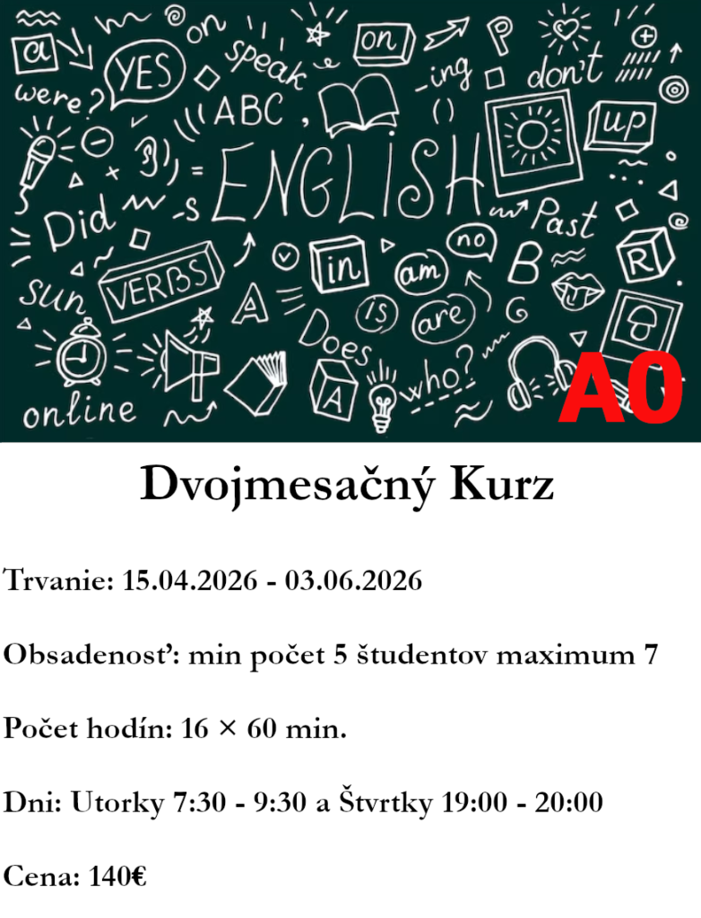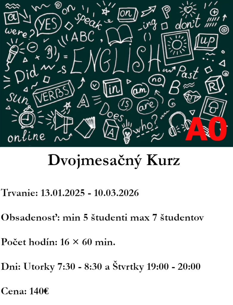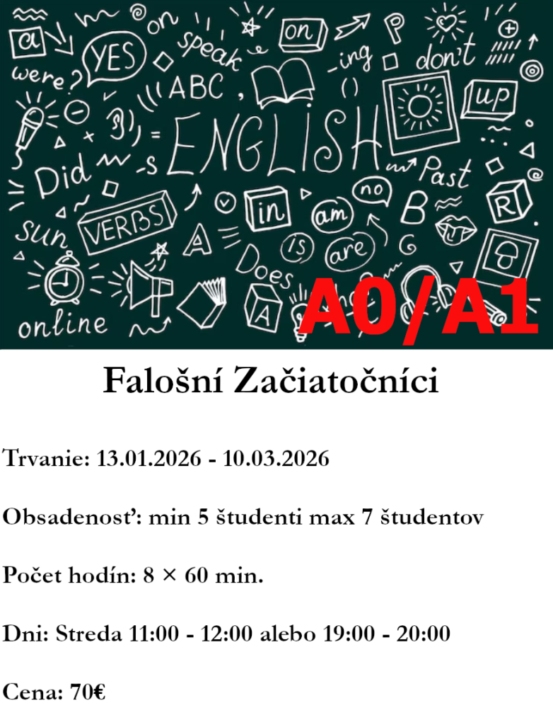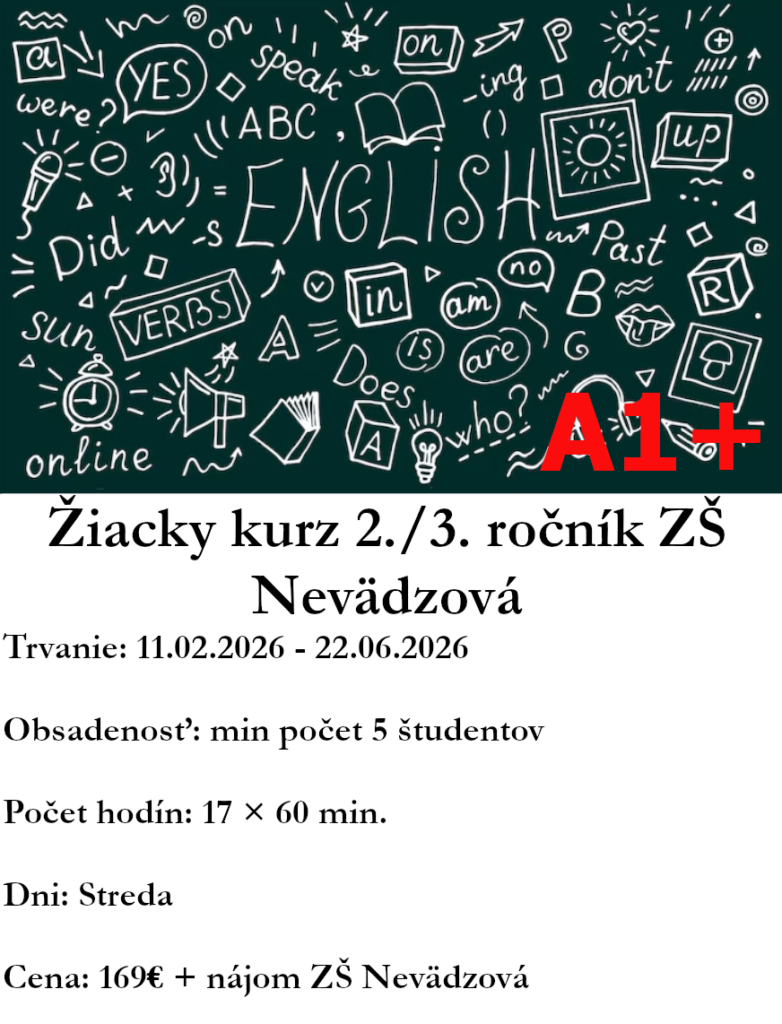 Anglický jazyk sa stal komunikačným jazykom číslo jeden. Z toho dôvodu nezáleží na tom, či cudzí jazyk zamestnanec aktívne používa vo svojej práci. V rôznych formách sa s ním stretávame každý deň a tým aj denne potvrdzujeme jeho potrebu. Ponúkame vám možnosť zdokonaliť sa v jazyku priamo u vás vo firme. Zabezpečíme pre vás: študijné materiály vytvorené podľa Vašich požiadaviek profesionálnych lektorov flexibilné hodiny lekcie pre skupiny, metóda one-to-one Zašlite nám vaše požiadavky a my vám vypracujeme cenovú ponuku. Tešíme sa na spoluprácu.